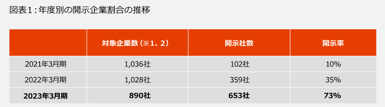 統合報告書やサステナビリティ報告書で「気候関連リスクおよび機会」「戦略や財務計画への影響」を開示する企業が増加しており、2021年3月期の対象企業1,036社が開示率10%から、2023年3月期には対象890社のうち653社が開示し開示率73%に達しました。