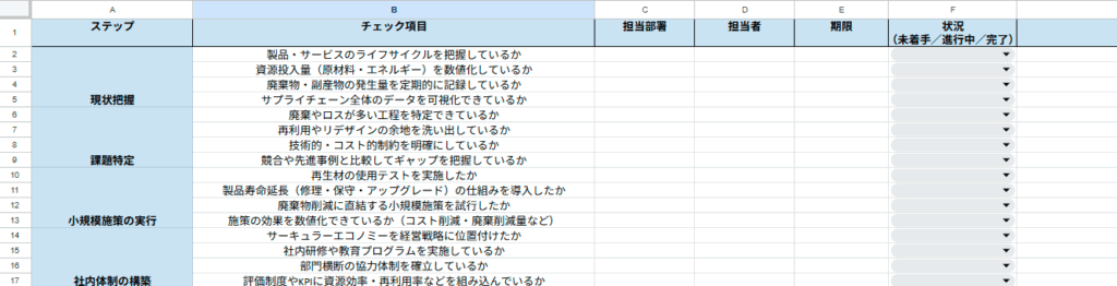 コピーしたシートでは、進捗を「未着手/進行中/完了」といったステータスで管理できます。さらに担当部署や担当者、期限を入力することで、部門横断の取り組みや改善点を見える化できます。
