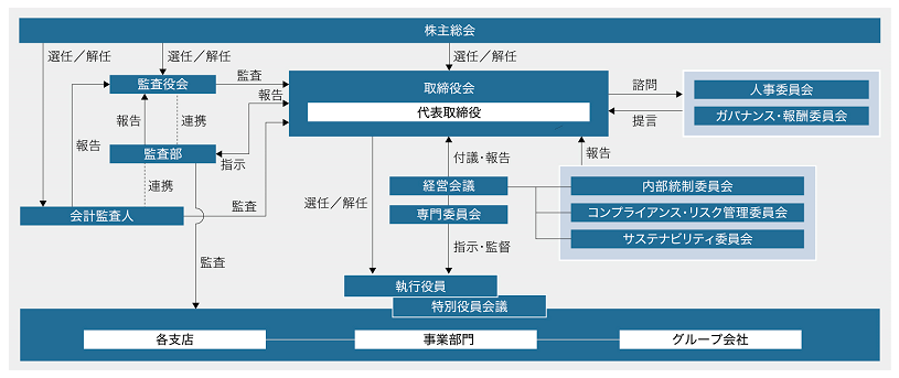 委員会制度 | 人事委員会・ガバナンス・報酬委員会を設置。他の取締役・社外取締役・社外監査役などが構成員。指名や報酬など重要事項の客観性・独立性を確保。 | 取締役・監査役候補選定や報酬制度などで利害調整の透明性が向上。ガバナンスの質を保つ。 |