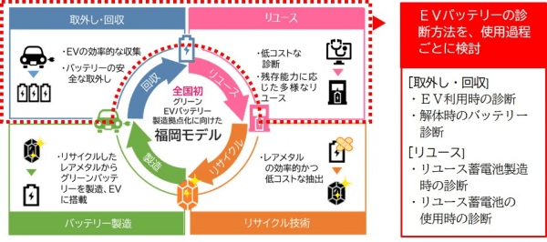 このモデルでは、解体時や再利用時にバッテリー診断を行い、再生可能エネルギー設備やリユース蓄電池として活用するほか、リサイクル技術で抽出した金属を新しいバッテリー製造に再投入する仕組みを整備する予定です。