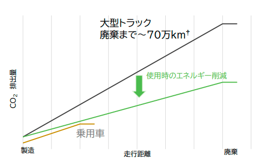 上図に示すように走行中のエネルギー削減がCO₂排出量全体に大きく影響します。