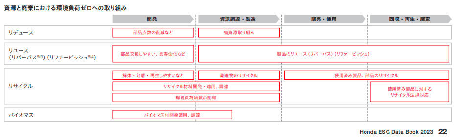本田技研工業では、レアメタルなどの資源の入手困難化や枯渇が、事業継続における大きなリスクになると認識しており、資源調達から廃棄に至るまでの全ライフサイクルで、環境負荷ゼロをめざした再利用設計を推進しています。